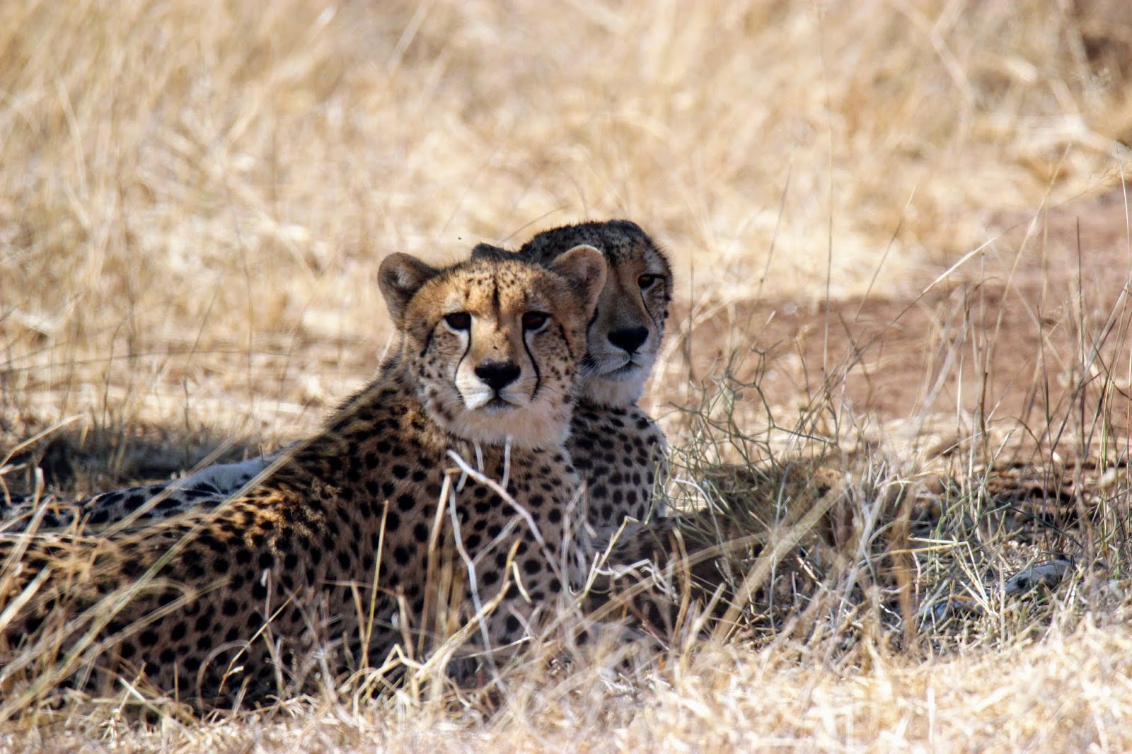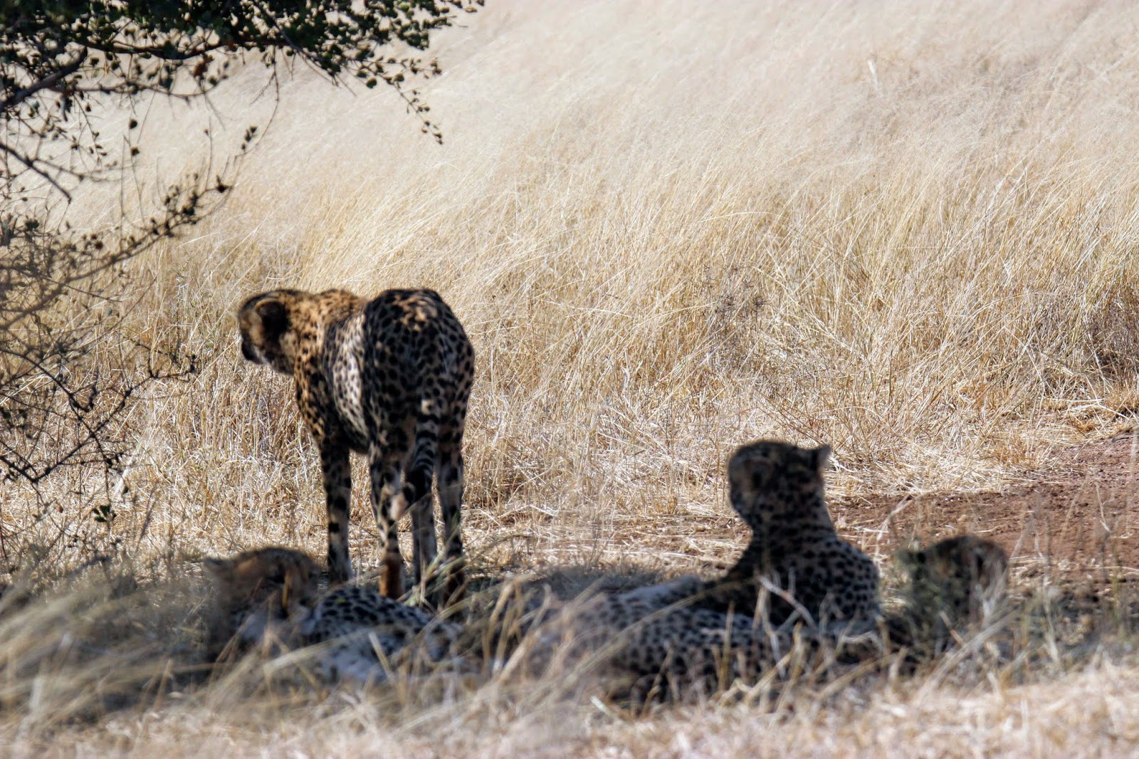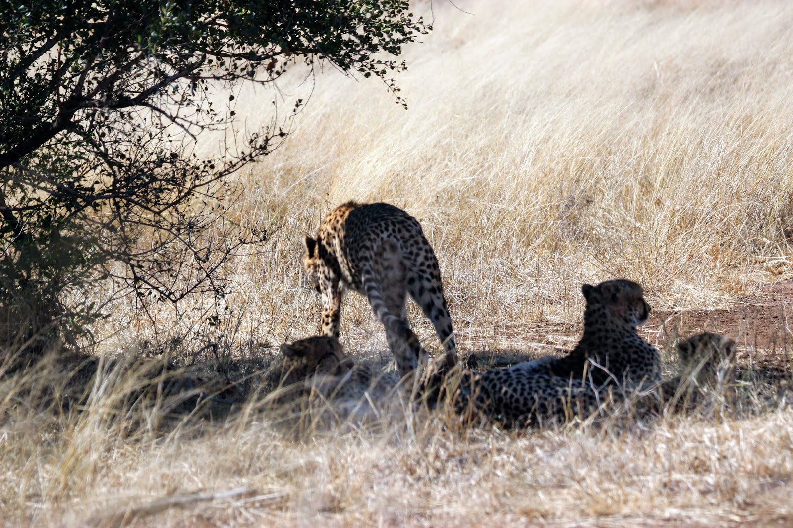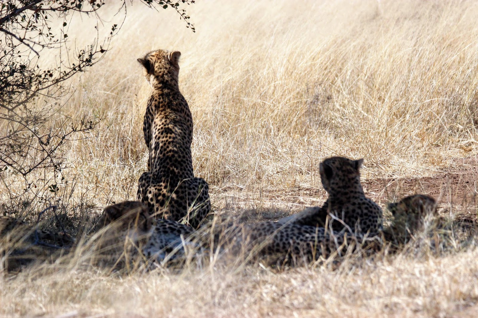 Entusiaste ci guardiamo attorno per cercare di guadagnare uno spot di osservazione, proprio davanti a noi una macchina decide di liberare la postazione e noi ci fiondiamo: da qui non ci sposta più nessuno! E li vediamo: quattro ghepardi accucciati all'ombra di un grosso arbusto a meno di cinque metri dalla strada! Che meraviglia, ci sporgiamo dai finestrini e scattiamo a più non posso: sono assolutamente consapevoli della presenza di auto tutto intorno a loro ma sembrano totalmente placidi e tranquilli. Sono bellissimi: non avevamo mai visto questo animale se non nei documentari e ha proprio l’aspetto di un gattone selvaggio. Il gruppo è sonnacchioso, ad eccezione di un esemplare che ad un certo punto si alza, facendo fluttuare la lunga coda, e si siede poco lontano dagli altri, di vedetta. Stiamo lì tantissimo tempo ad osservarli e fotografarli, completamente rapite. Non saranno i leoni ma è un avvistamento per noi assolutamente eccezionale e ci stupiamo di averlo fatto in queste ore centrali della giornata, quando i predatori dovrebbero essere meno attivi. Che fortuna, non vorremmo più venire via!