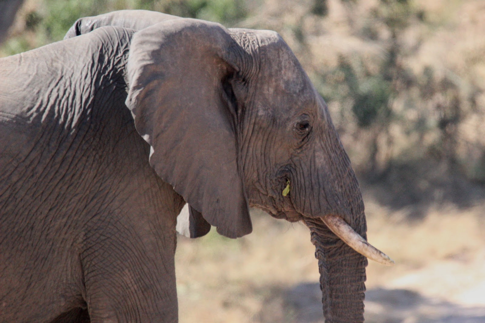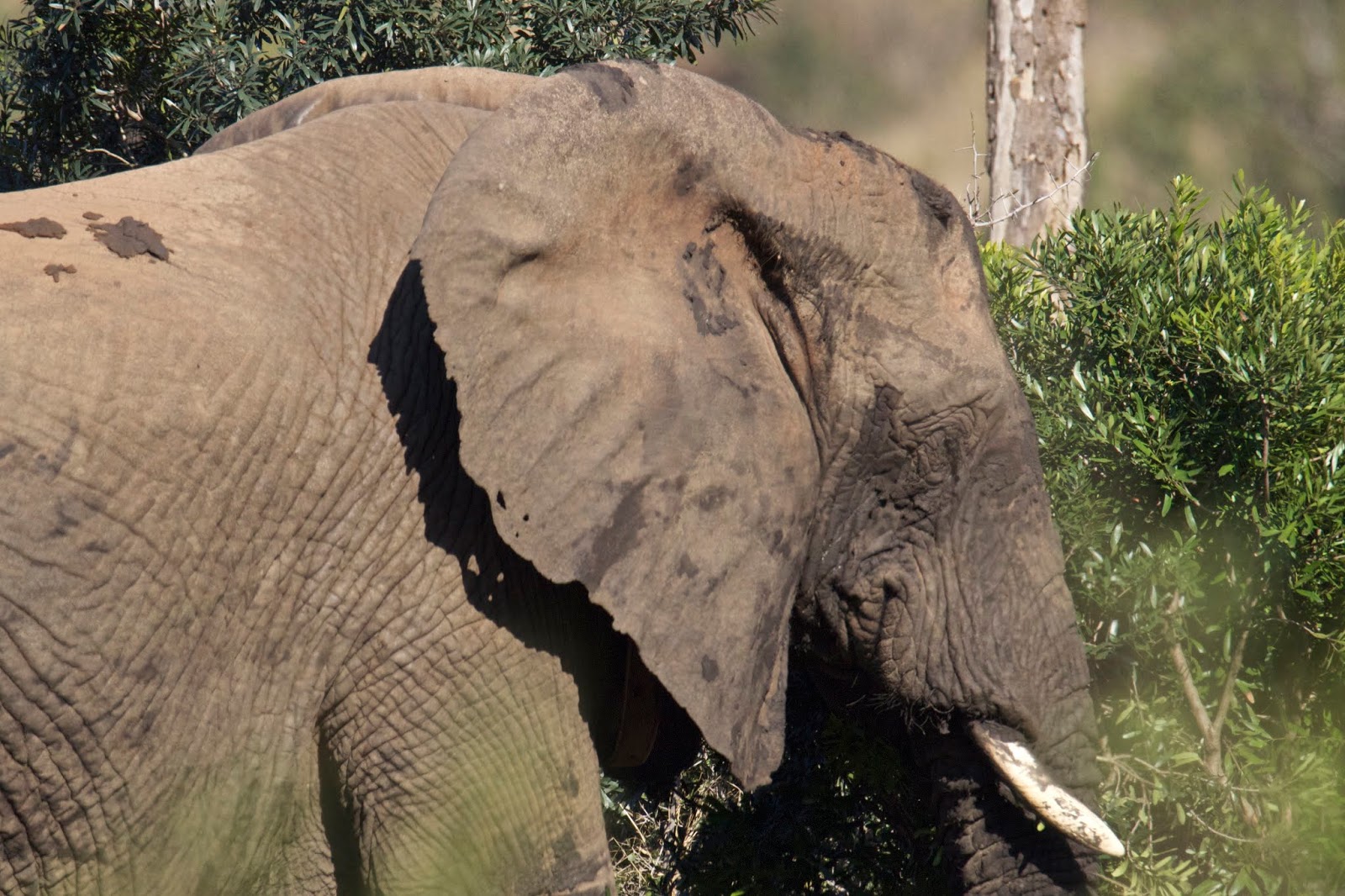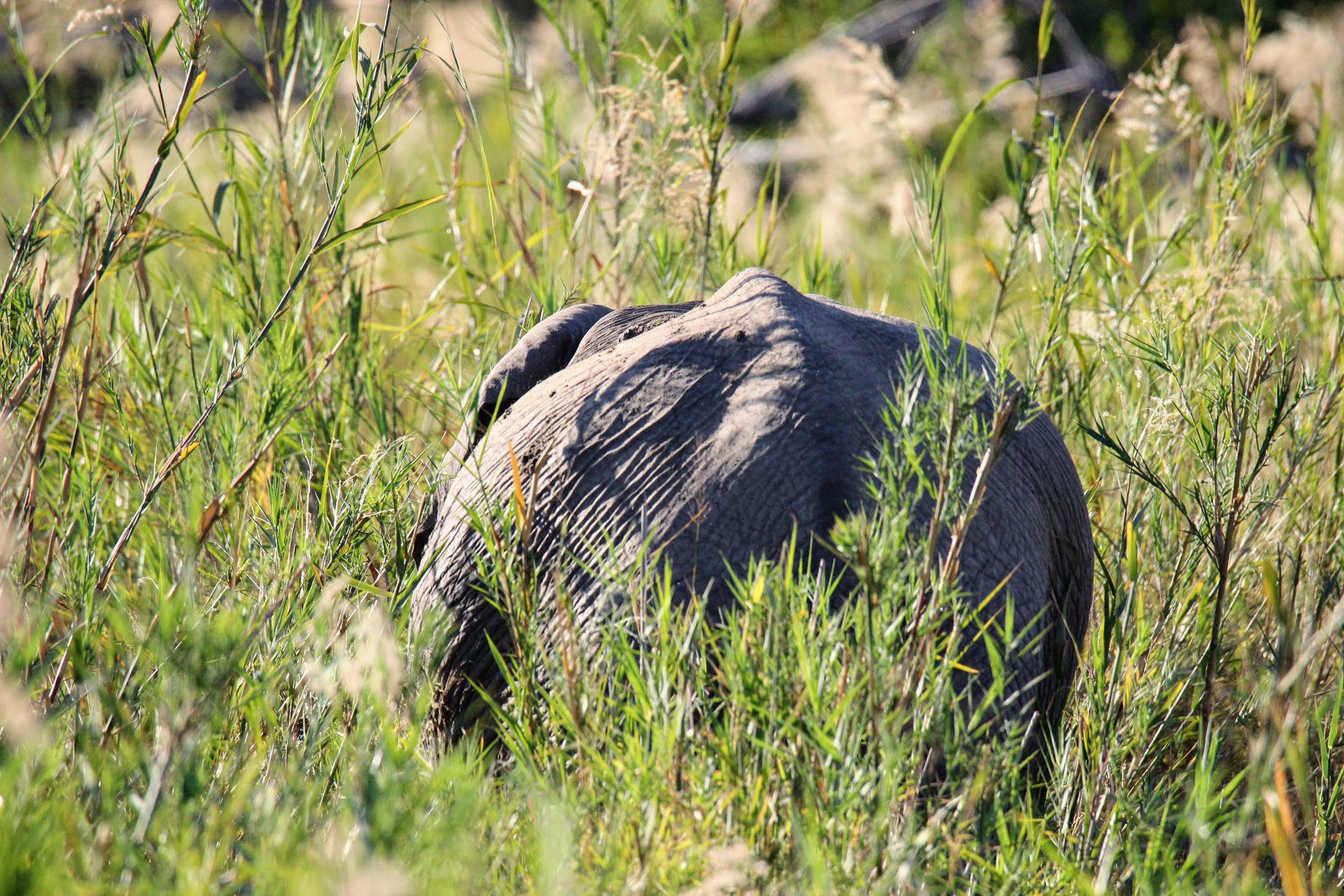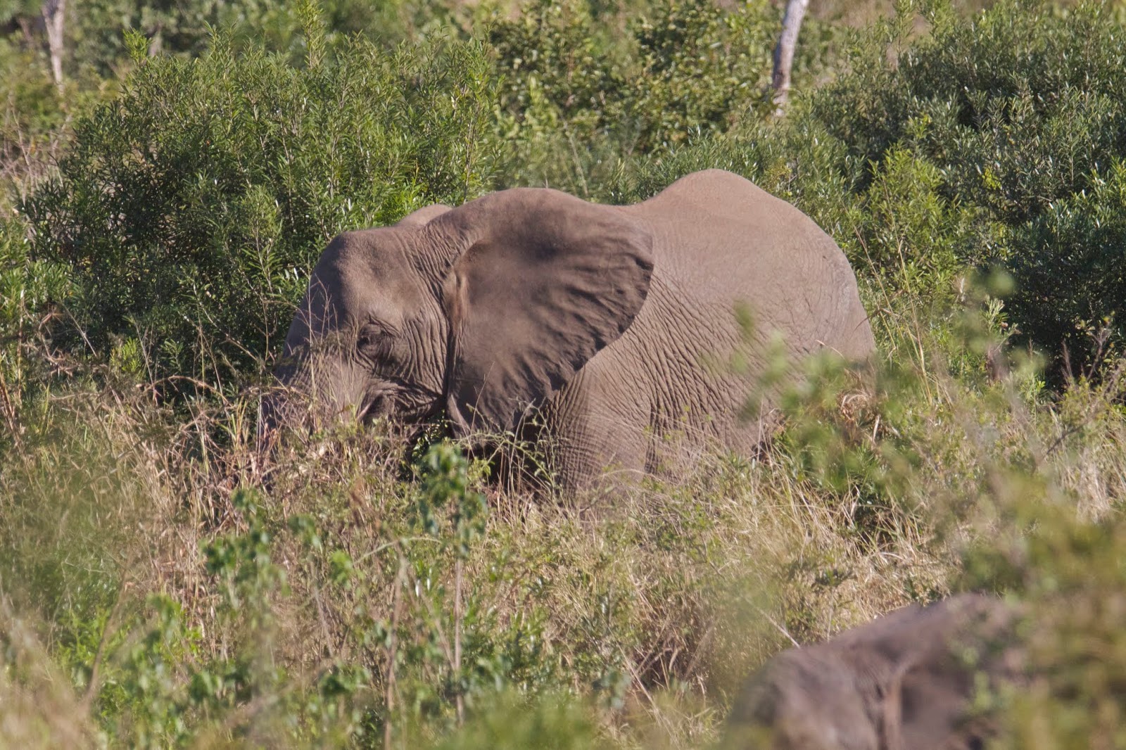 Ce li troviamo sulla sinistra, in mezzo ad un’ampia zona con arbusti piuttosto alti e verdi. Quello che non ci piace è che a destra della strada sterrata, piuttosto stretta, c’è un piccolo pendio scosceso completamente ricoperto di alberi e fitta vegetazione quindi non riusciamo a capire se tutta la mandria si trova tutta già alla nostra sinistra. Seguiamo alla lettera le istruzioni che abbiamo appena ripassato e ci fermiamo immediatamente tenendo la macchina in moto, nel frattempo notiamo gli elefanti muoversi in continuazione per mangiare da un arbusto all’altro, tranquilli e del tutto indifferenti a noi. Li osserviamo e fotografiamo per un po’ ma siamo molto indecise se superarli o meno. Smettiamo di fotografare e cerchiamo di concentrarci su eventuali rumori intorno a noi. Fortunatamente la nostra pazienza paga perché proprio nel momento in cui stavamo per ripartire, vediamo muoversi le chiome degli alberi sulla nostra destra e un elefante enorme irrompe trotterellando in mezzo alla strada dandoci la schiena. Restiamo in silenzio e lui, o lei, fortunatamente senza voltarsi dalla nostra parte, allarga le zampe per fare una sontuosa pipì+cacca proprio nel mezzo della strada prima di ricongiungersi al resto della mandria. Ci guardiamo stupefatte e anche un po’ spaventate, ci assicuriamo ancora qualche minuto che fosse veramente l’ultimo e poi Chiara ingrana la marcia e ci porta in salvo oltre il gruppo e a distanza di sicurezza.