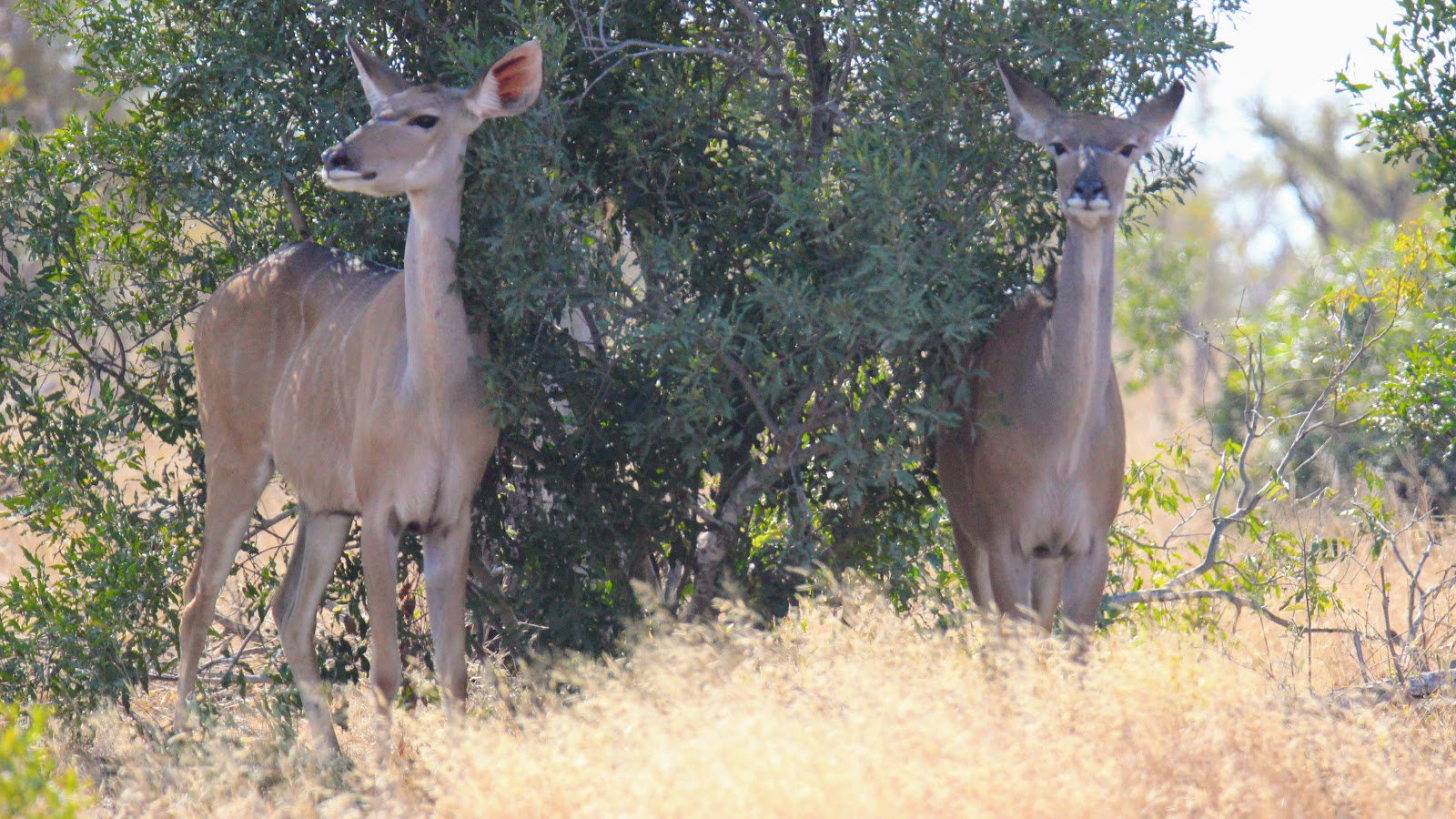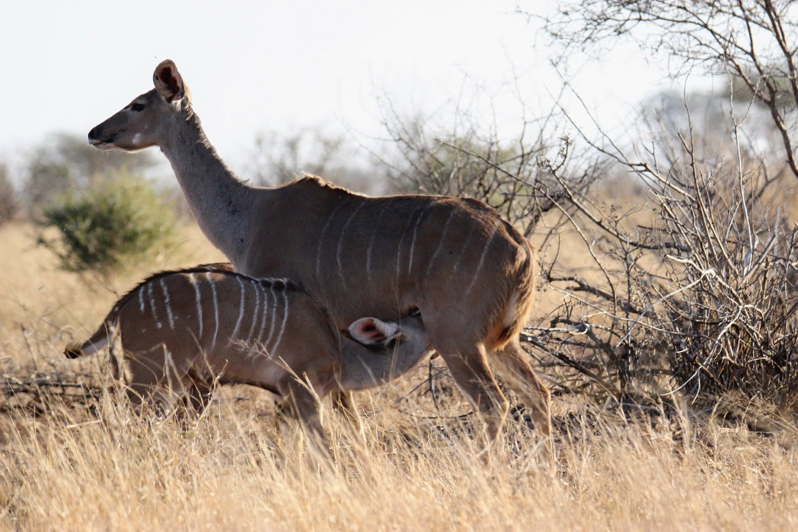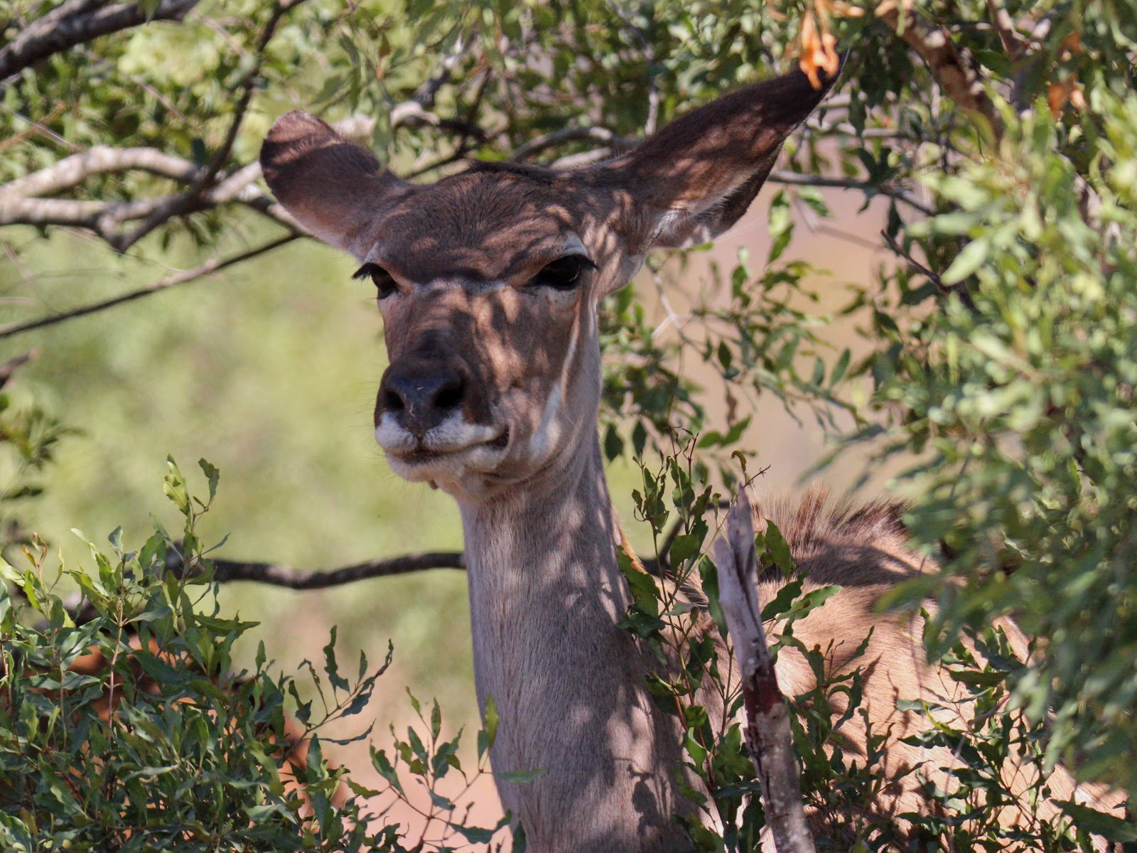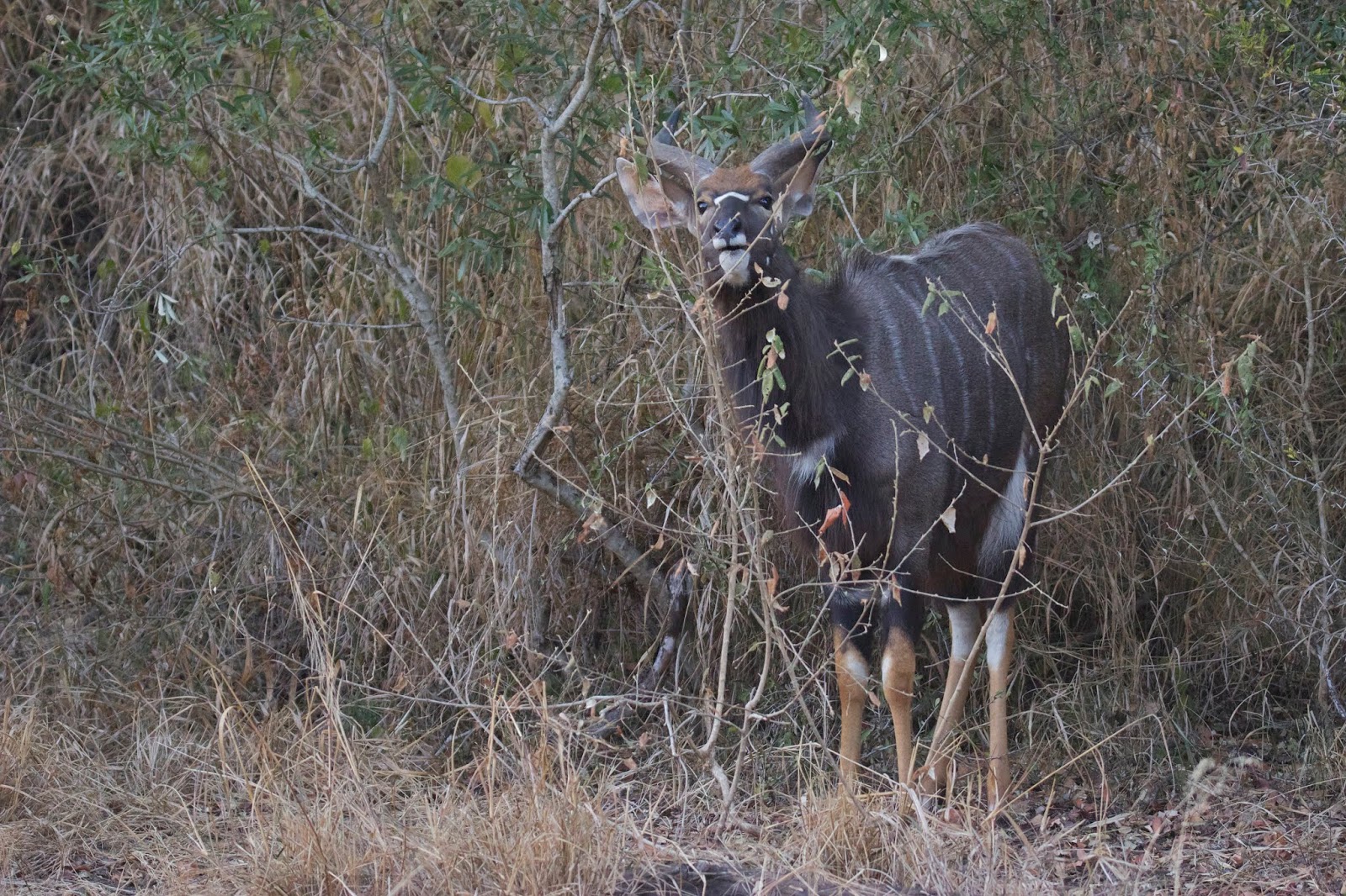Decidiamo di percorrere verso nord l’asfaltata H-10 fino all’incrocio con la H1-2 che ci riporterà verso Skukuza. La H-10 è una strada spettacolare, soprattutto nell’ultimo tratto dove attraversa ampie distese di savana intervallate dal cosiddetto Lebombo Mountain bushveld. Qui osserviamo diverse specie di uccelli mai avvistati prima, tra cui alcuni rapaci, elefanti e una bellissima famiglia di kudu con i piccoli.