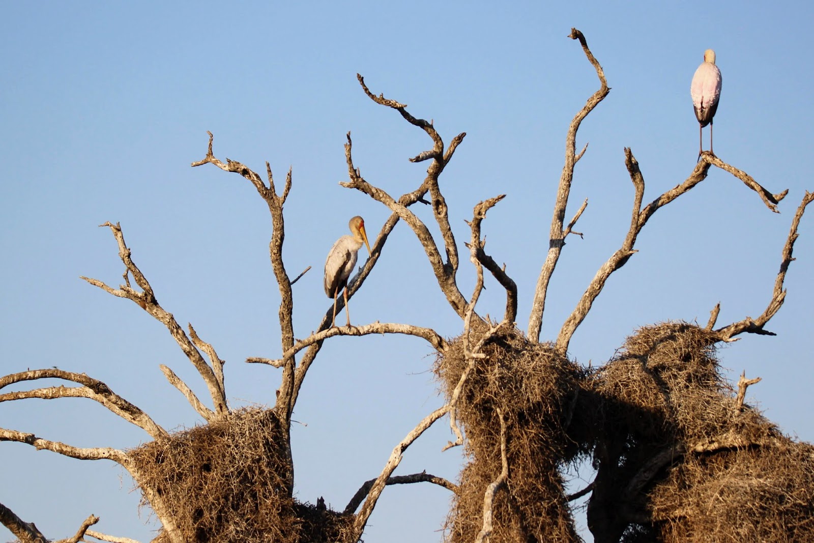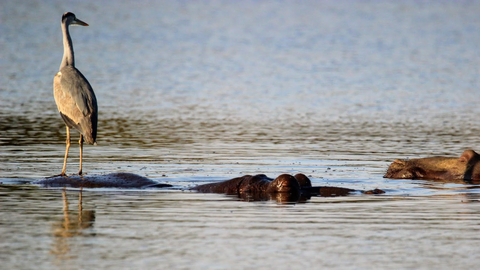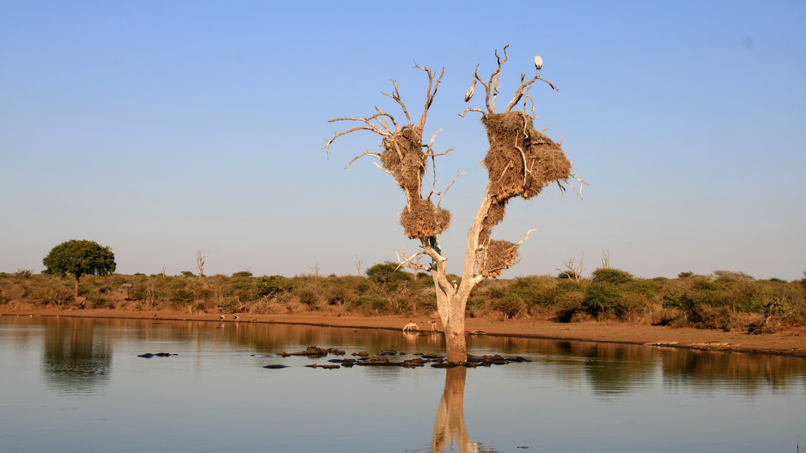 Dopo che anche l’ultimo pachiderma è passato, sparendo nel bush alla nostra sinistra, decidiamo di proseguire e, dopo pochi chilometri, svoltiamo sulla destra fermandoci letteralmente sulle rive della Sunset Dam, una pozza molto conosciuta a giudicare dal quantitativo di auto che vi sta sostando. In effetti si assiste ad uno spettacolo piuttosto vario, in mezzo alla pozza c’è un albero secco i cui rami contorti ospitano un quantitativo indefinibile di nidi di cicogne Yellowbilled, sotto l’albero sonnecchia una numerosa colonia di ippopotami, a pelo d’acqua e sulle rive, invece, scorgiamo tantissimi coccodrilli, e gli onnipresenti impala. Non propriamente il luogo adatto per farsi una nuotata! Fermiamo il motore e ci godiamo il momento scattando diverse fotografie a questa spettacolare scenografia naturale. Con l'aiuto delle immagini della guida identifichiamo poi anche un airone cenerino e un falco giocoliere.