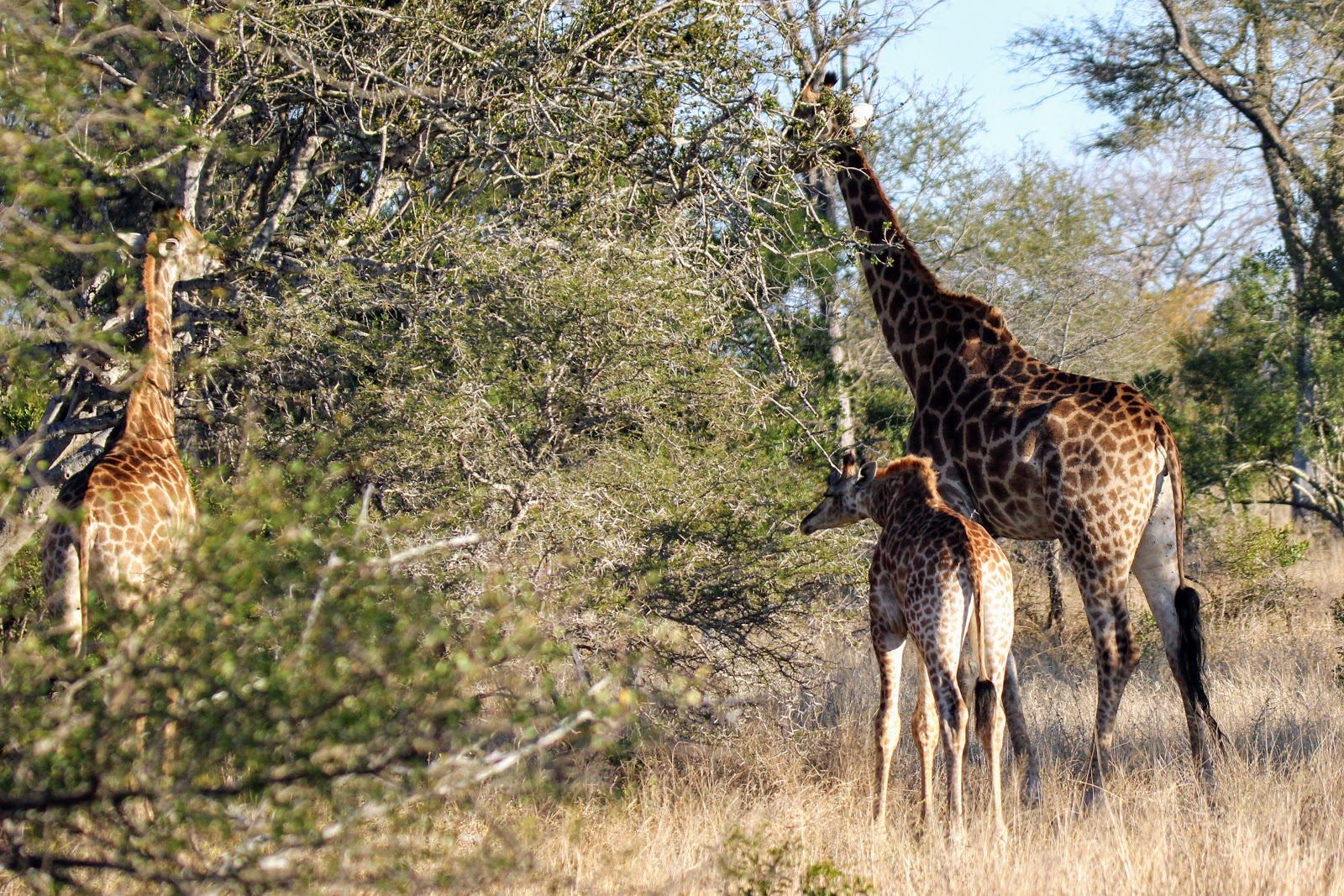 Improvvisamente, il rinoceronte che era rimasto più in disparte, avanza verso il compagno con due piccoli passi trottati, quasi sgroppando e Sibusiso, attento ma sempre con un sorriso rassicurante, ci fa cenno di alzarci piano ed indietreggiare. Facciamo qualche passo rimanendo rivolti verso i rinoceronti, poi ci dice di girarci e camminare tranquillamente dietro di lui. Riprendiamo tutti a respirare! Che emozione! Seguiamo Subisiso che ci riporta alla macchina ma non prima di un altro bellissimo incontro ravvicinato: le tre giraffe avvistate prima, a una decina di metri da noi, che fotografiamo con la bella luce del sole ormai levato sopra l’orizzonte.